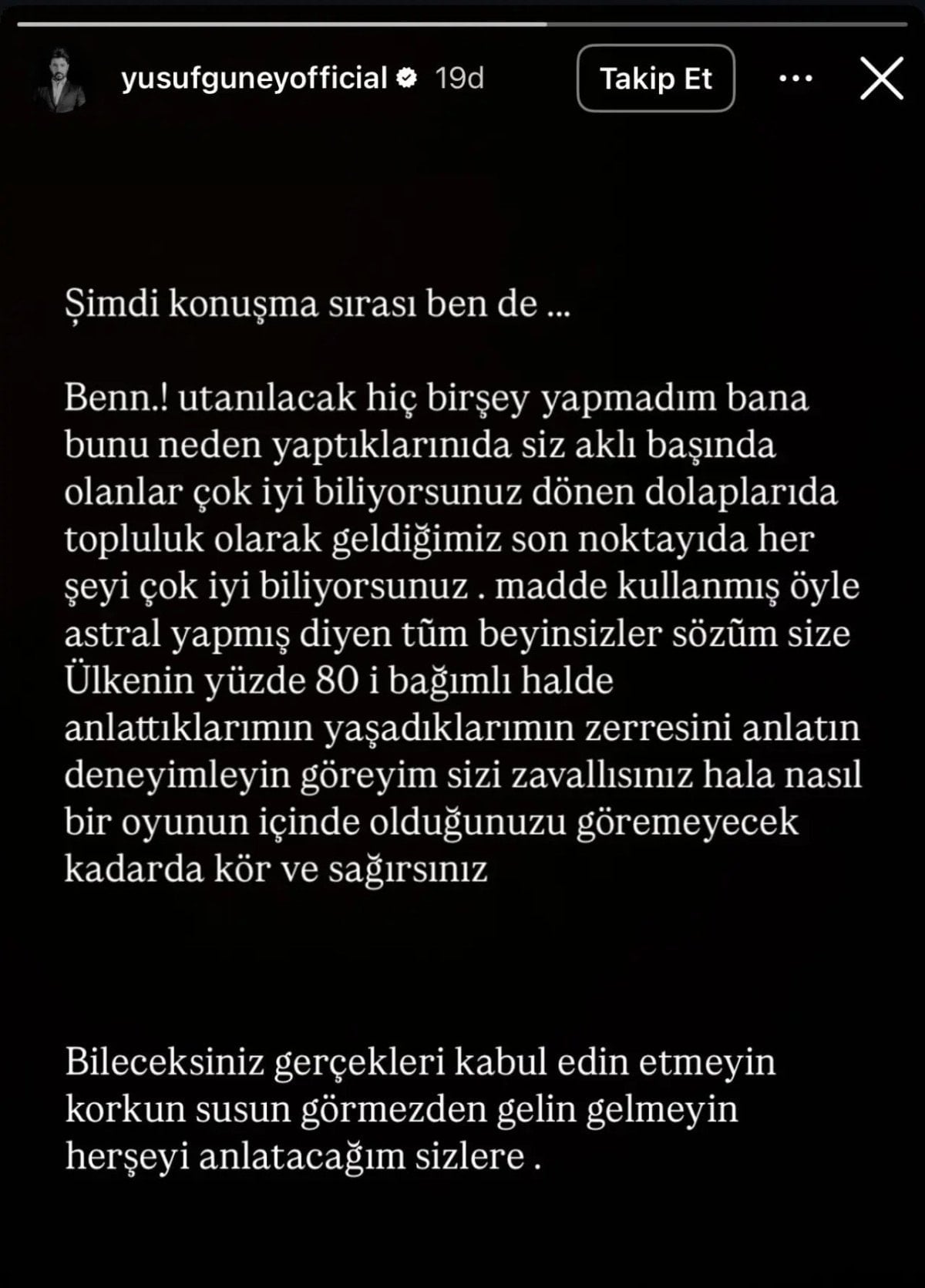 ”Şimdi konuşma sırası bende… Dönen dolapları da, topluluk olarak geldiğimiz son noktayı da, her şeyi çok iyi biliyorsunuz. Madde kullanmış, öyle astral yapmış diyen tüm beyinsizler; sözüm size.