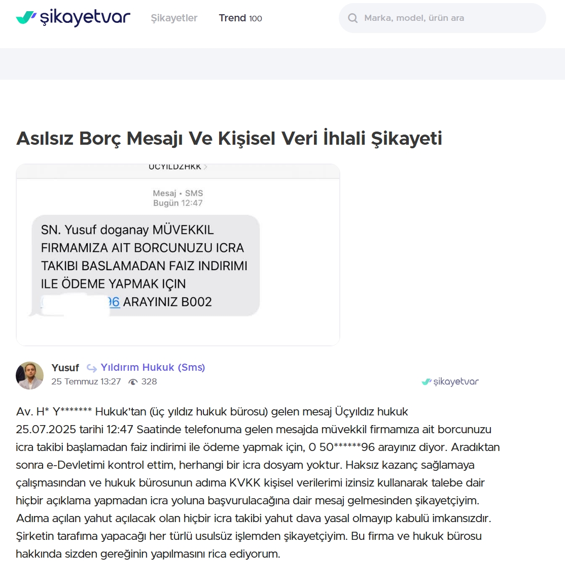 Vatandaşa önce bir mesaj geliyor: “Hakkınızda tebligat var.” Ardından özel bir numaradan aranıyorsunuz: 0501 177 92 96. Size, hiç haberinizin olmadığı bir sipariş yüzünden 12.000 TL’lik icra takibi başlatıldığı söyleniyor. İşte yeni dolandırıcılık modelinin perde arkası: “Üç Yıldız Hukuk Bürosu” ve “Yanıkoğlu Online Satış” adlı hayalet firmalar.