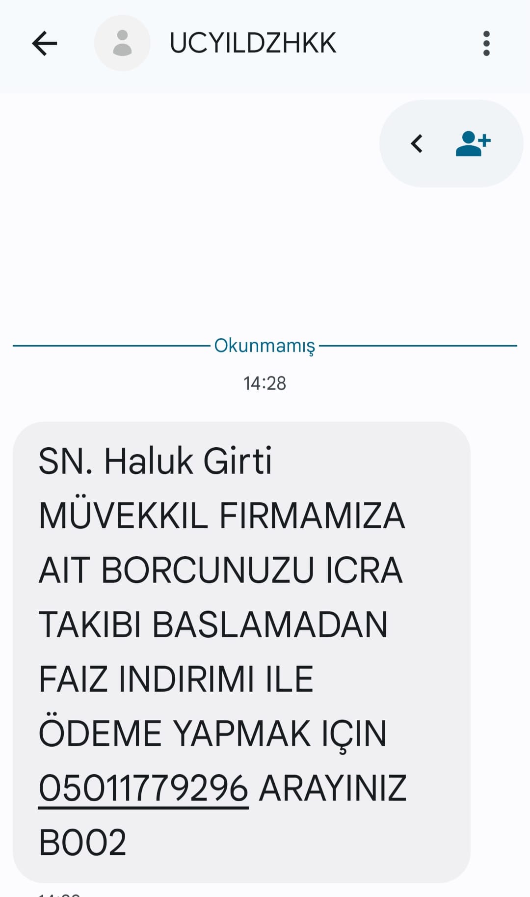 Gazeteci Haluk Girti’ye gelen bir SMS’te, “Üç Yıldız Hukuk Bürosu” adına tebligat yapılacağı bildirildi. SMS’in hemen ardından 0501 177 92 96 numaralı hat üzerinden arama geldi. Arayan kişi, “Yanıkoğlu Online Satış” adlı bir firmadan GPS cihazı siparişi verildiğini ancak teslim alınmadığını söyledi.