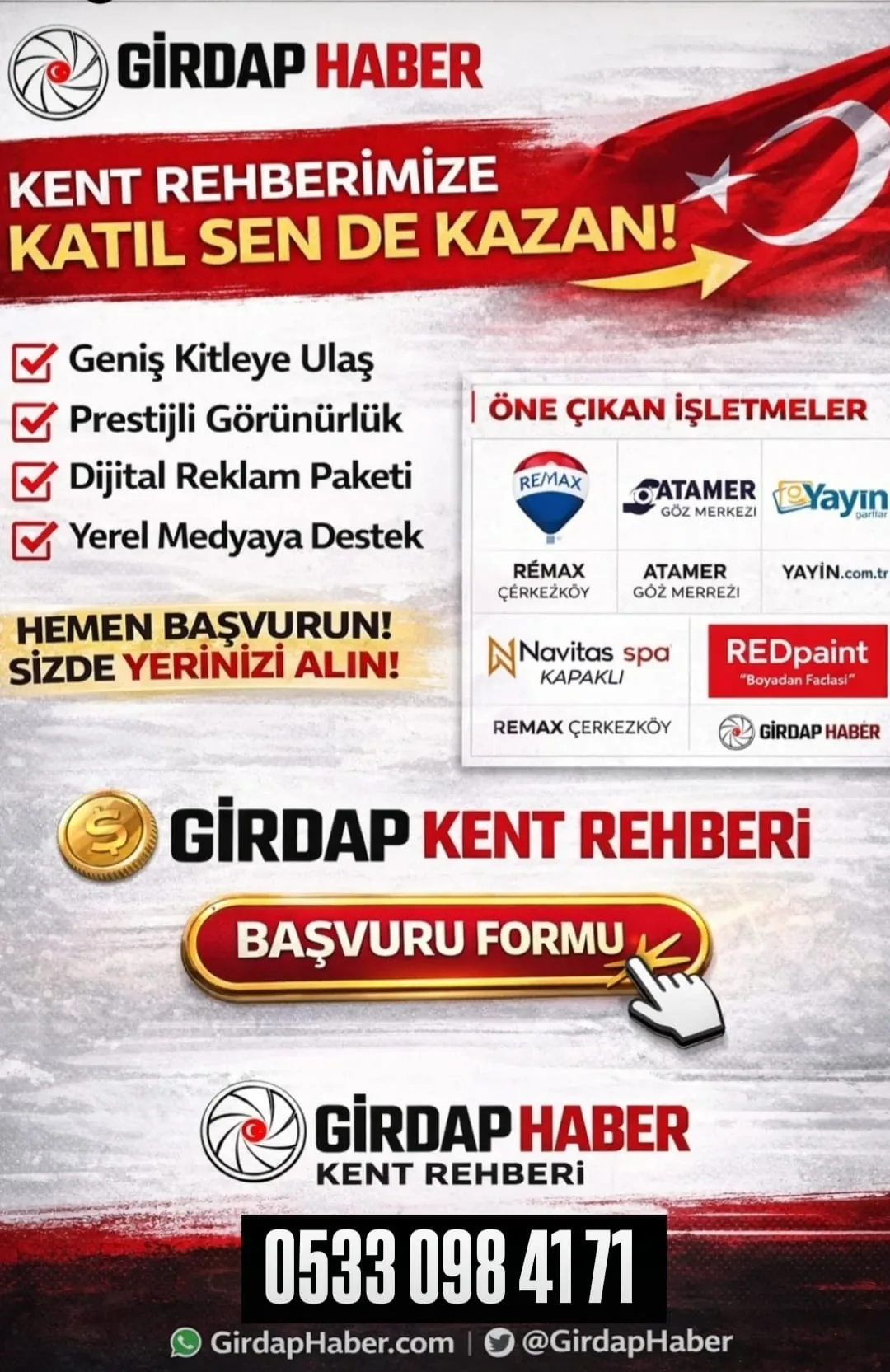 Türkiye’nin bağımsız ve güçlü yayıncılığın adresi olan Girdap Haber, ulusal ve yerel işletmelere yönelik yeni bir projeyi hayata geçirdi. “Kent Rehberimize Katıl, Sen de Kazan!” sloganıyla duyurulan kampanya kapsamında işletmeler hem dijital görünürlük elde edecek hem de bağımsız yerel medyaya destek veren “Güç Ortağı” statüsü kazanacak.