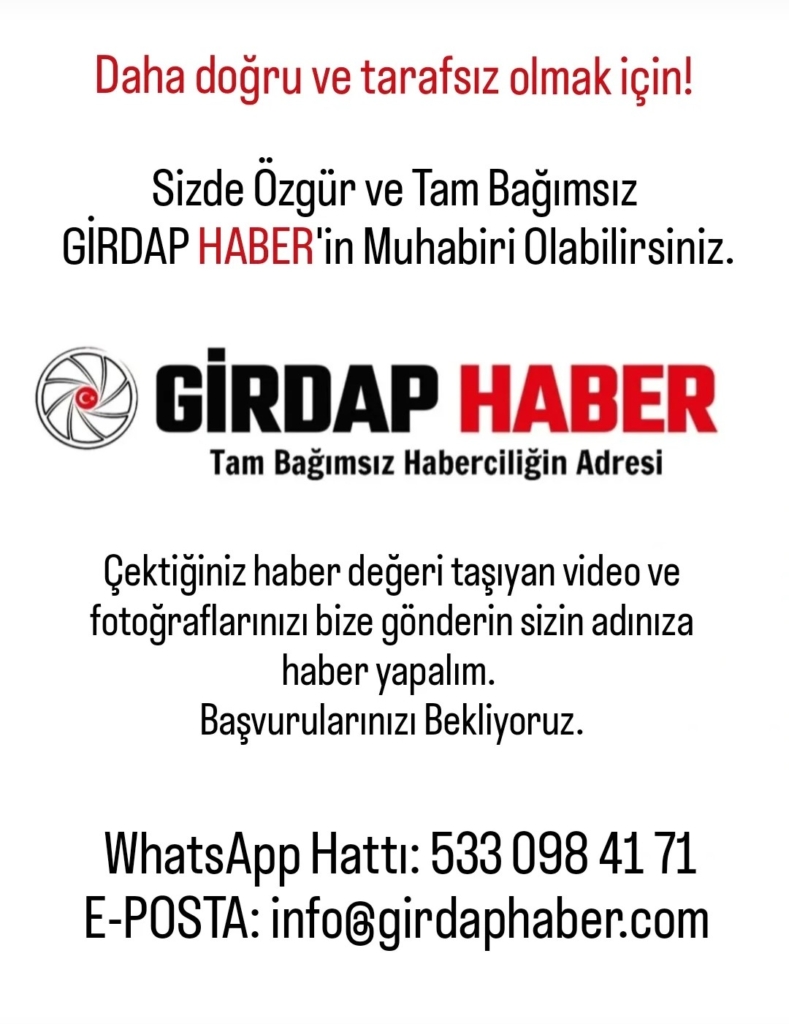 Daha doğru ve tarafsız olmak için sizde özgür ve bağımsız haberciliği ilke edinmiş GİRDAP HABER de muhabirlik yapabilirsiniz. Biz kimseye iş teklifi yapmıyoruz yanlış anlaşılmasın, bu güne kadar birçok ulusal medyada WhatsApp ihbar hattına gönderdiğiniz haber değerini taşıdığına inandığınız tüm çektiğiniz video ve fotoğraflarınızı bize de gönderebilirsiniz. Bizim diğer medya kuruluşlarından farkımız emeğinizin haber sitemizde yayınlanarak sizi hem yurtta hem de dünyada yaşanan gerçekleri kamu oyuna kesintisiz ve sansürsüz yayınlanabilmesidir. Bize siyasi. güncel. spor. magazin ve hatta hiç kimsede olmayan özel belge ve bilgileri de ulaştırarak haber olmasını sağlayabilirsiniz. Vatandaş olarak herkes üstüne düşeni yerine getirirse ülkede hiç bir gerçek gizli kalmayacaktır.