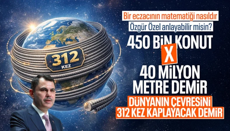 Bu da kaba bir hesap yapıldığında, 3 yıllık süreçte inşa edilen 455 bin deprem konutunda kullanılan toplam çelik donatı uzunluğunun, dünyayı 312 kez saracak uzunluğa ulaştığı sonucuna varılıyor.