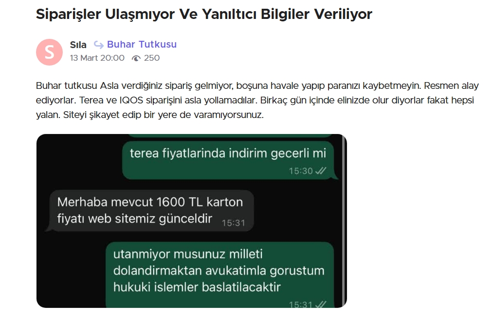 Son dönemde tütün ürünleri pazarında popüler hale gelen IQOS TEREA markası adı altında internet üzerinden satış yapan bir firma, birçok tüketiciyi mağdur ediyor. Vatandaşlar, sipariş verdikleri ürünleri ya eksik ya da hiç teslim alamadıklarını belirterek şikayetlerini dile getiriyor.