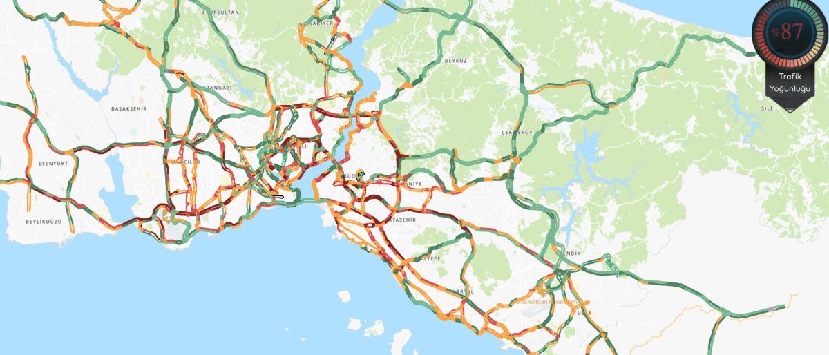 İstanbul Büyükşehir Belediyesi (İBB) Cep Trafik verilerine göre ise trafik yoğunluğu, saat 17.32 itibariyle yüzde 87’ye ulaştı.
