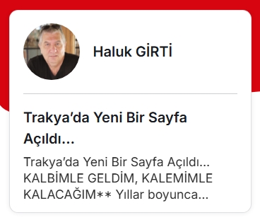 Ben Haluk GİRTİ… Kiminin de Haluk Abisi Olarak, Trakya’da yeni bir dönem başlatıyorum. Vatana millete de hayırlı olsun inşallah.