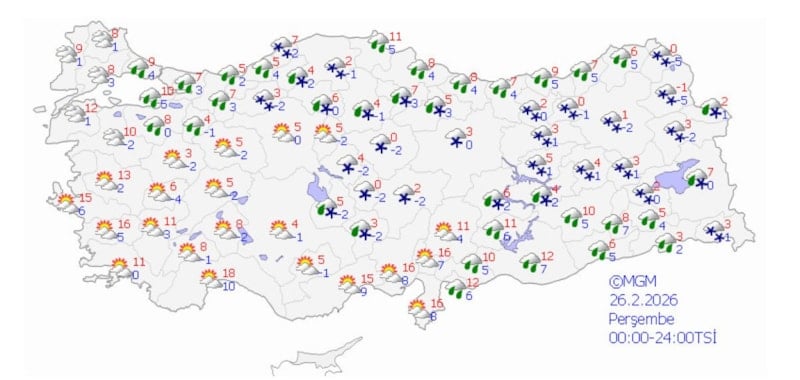 Marmara, Ege ve Akdeniz’de parçalı bulutlu ve daha ılıman, İç Anadolu ve Karadeniz’de 4-12 derece civarında ve Doğu Anadolu’da 0-8 derece bandında sıcaklıklar öngörülüyor.