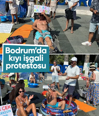 Kıyı işgallerine dikkat çekmek isteyen ve kendilerini ‘Özgür Kıyılar Bodrum İnisiyatifi’ olarak tanımlayan bir grup, kent meydanında şezlonglu, plaj havlulu ve şişme havuzlu eylem yaptı.