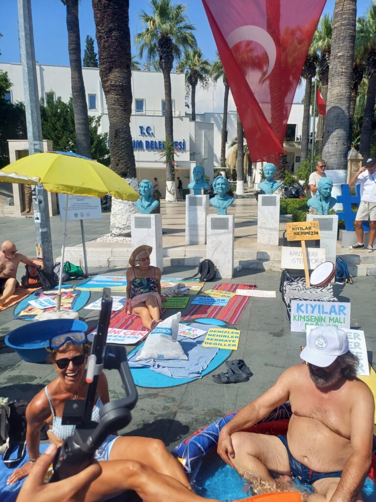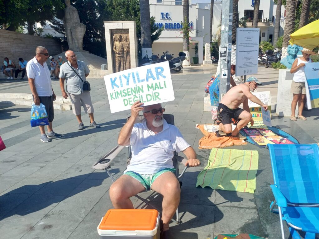 Bodrum’da kıyıların yağmalanmasına tepki gösteren halk Bodrum Belediyesi önünde eylem yaptı. Eylemciler, kıyılarda denize girecek yer kalmadıysa belediye, kaymakamlık, valilik önünde yıkanır, ve güneşlenirken yetkililere çağrıda bulunuyoruz dediler.